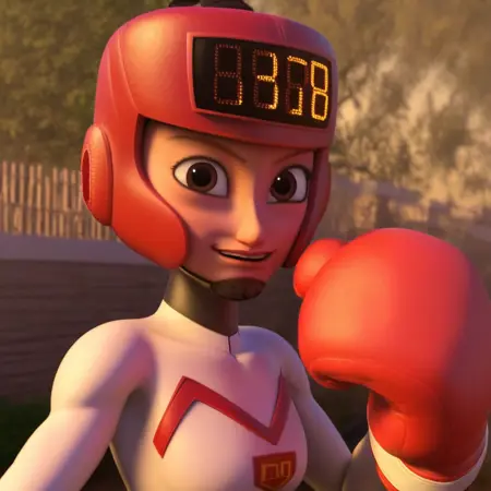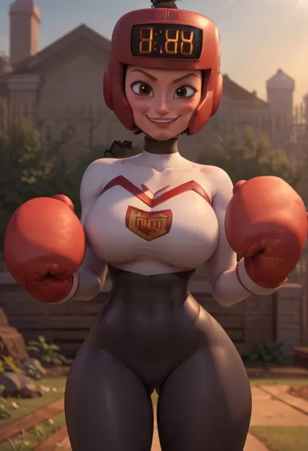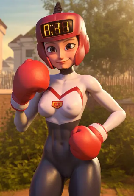 トリガーワード: 1girl, Solo, Kayoh_Hi, 淡い肌, 薄茶色の目, 濃い茶色の髪, ヘルメットの上部から飛び出る短いカールしたポニーテール, 濃い茶色の眉, デジタル得点表示付きの赤いボクシングヘルメット, 赤いボクシンググローブ, 黒白の全身フィットしたスポーツスーツ, 胸元のロゴ, 白いボクシングブーツ