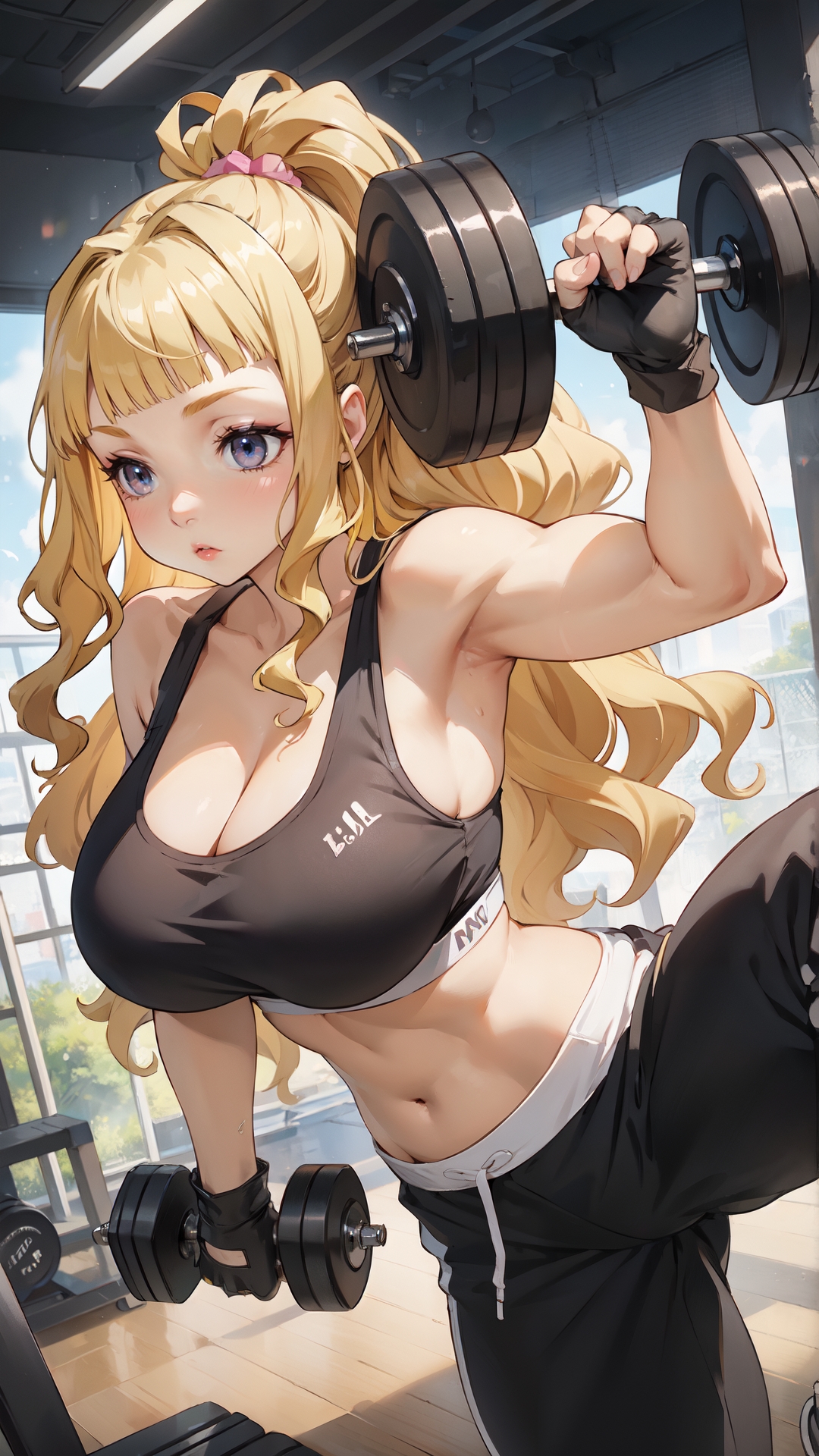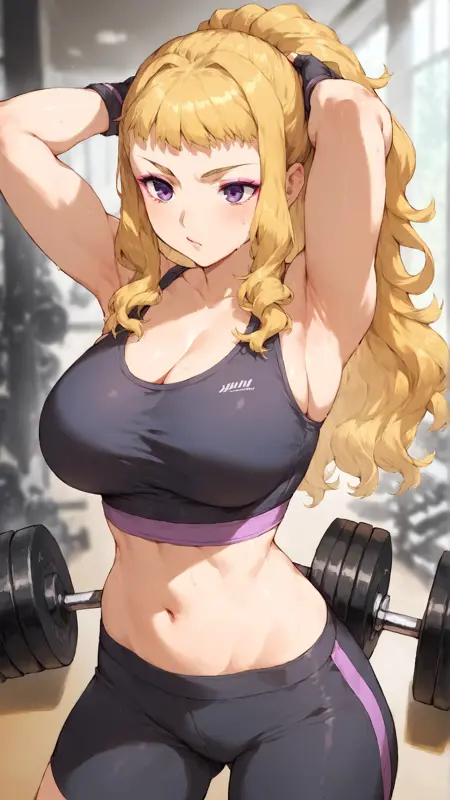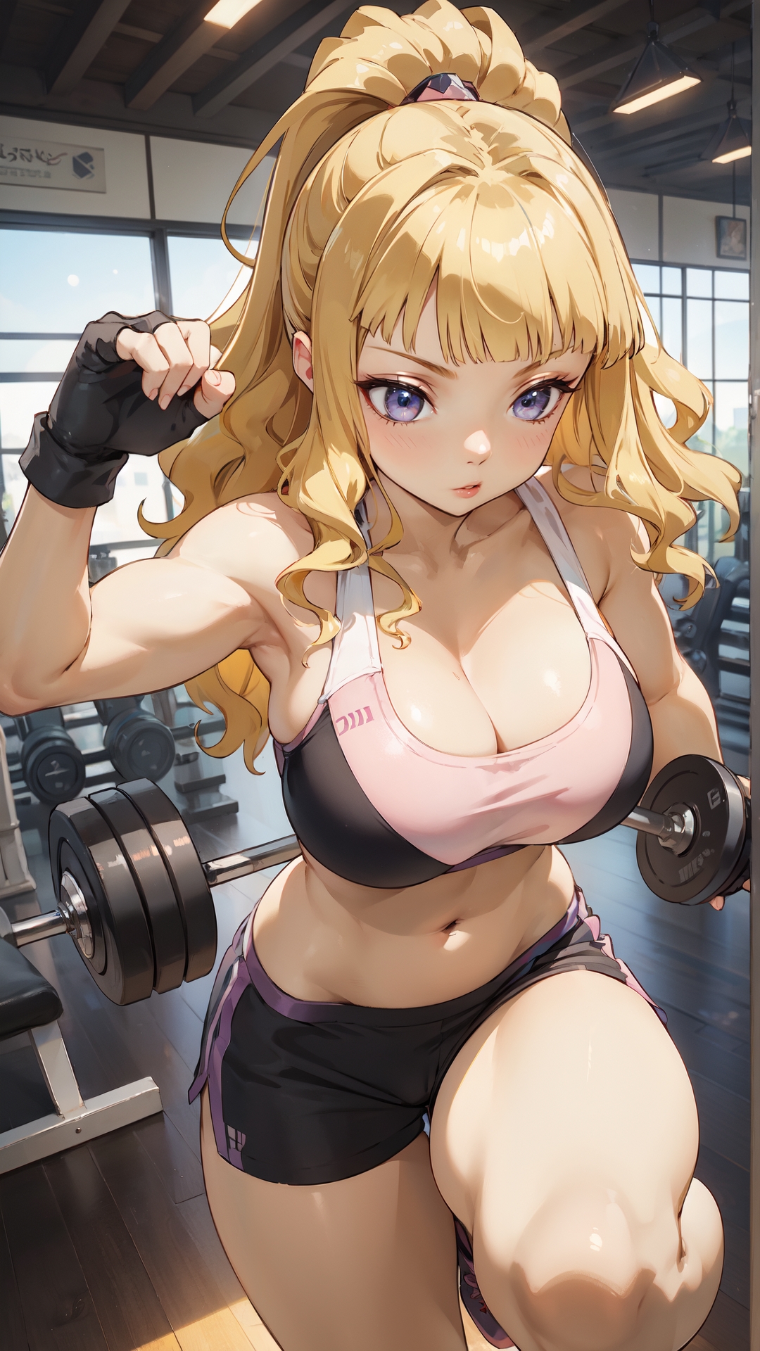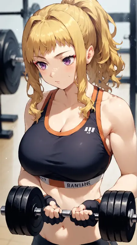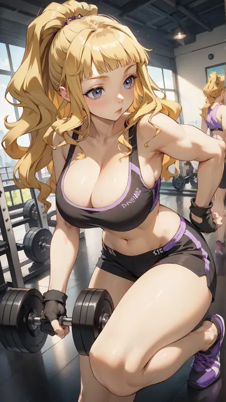 예시 프롬프트: "suzushiro_haruka, an anime girl, 1girl, solo, long hair, breasts, blonde hair, gloves, navel, cleavage, purple eyes, ponytail, midriff, fingerless gloves, makeup, eyeshadow, sports bra, exercise, dumbbell, weightlifting"