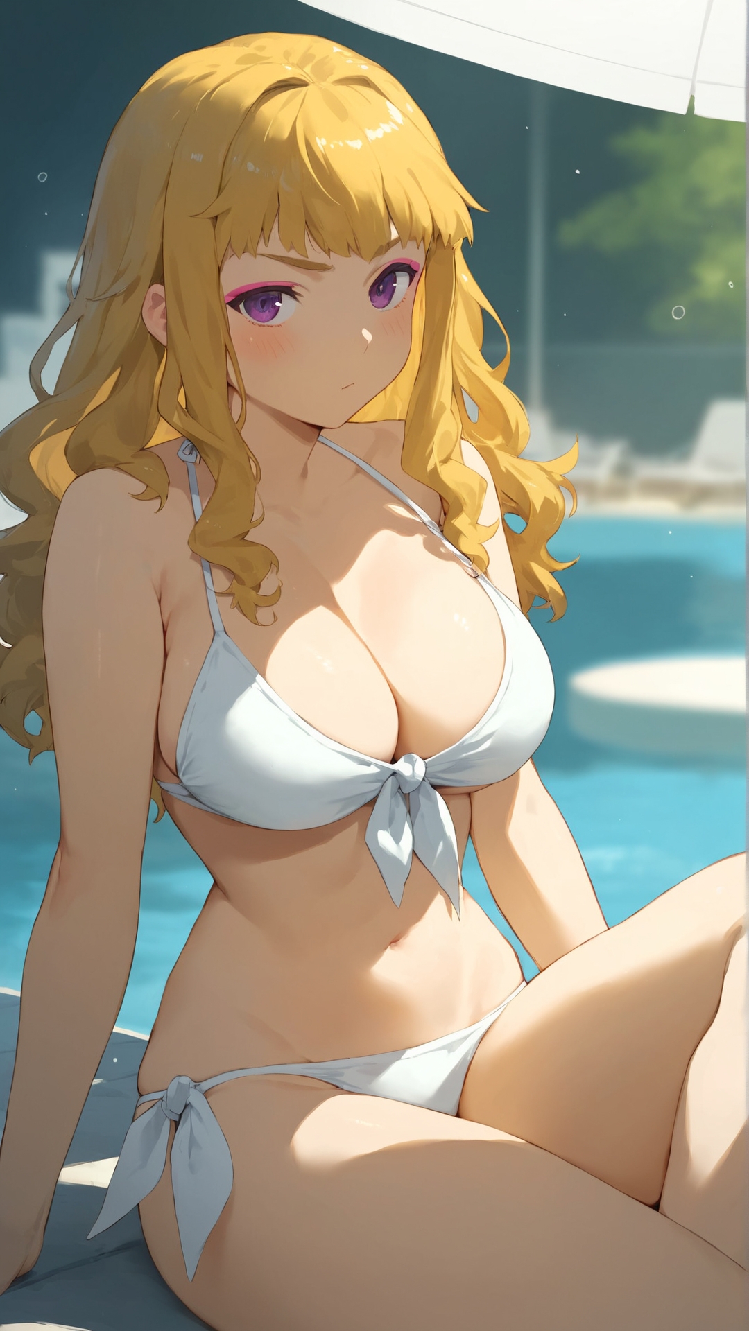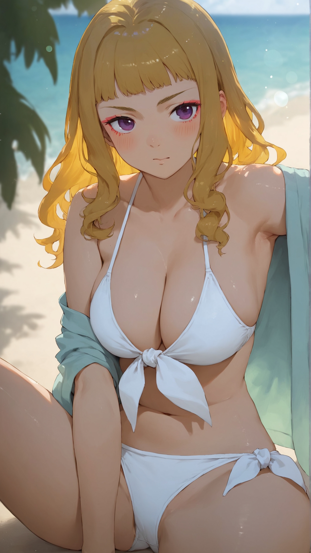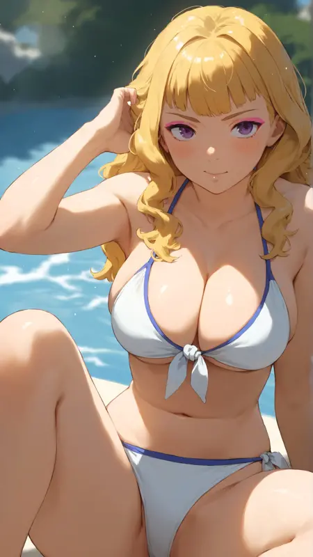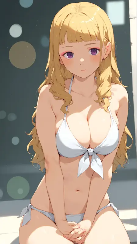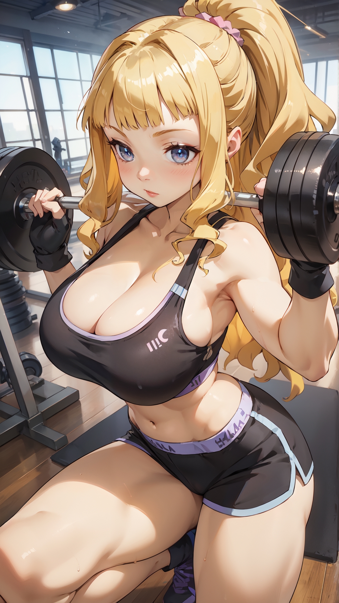 예시 프롬프트: "suzushiro_haruka, an anime girl, 1girl, solo, long hair, breasts, blonde hair, gloves, navel, cleavage, purple eyes, ponytail, midriff, fingerless gloves, makeup, eyeshadow, sports bra, exercise, dumbbell, weightlifting"