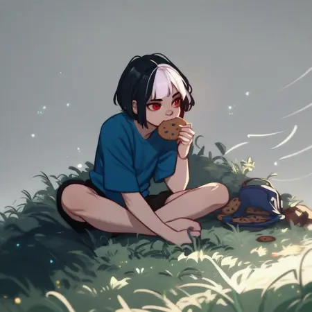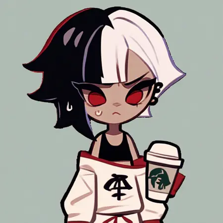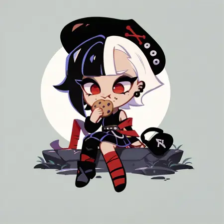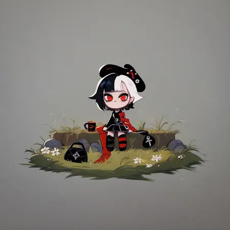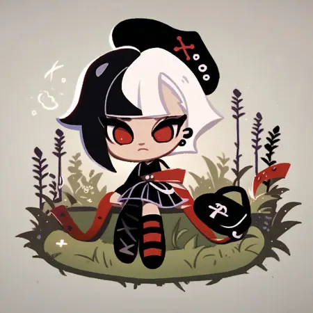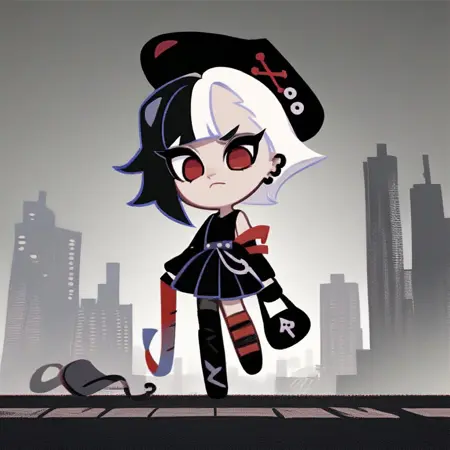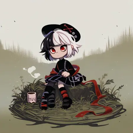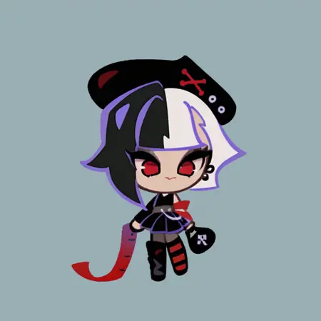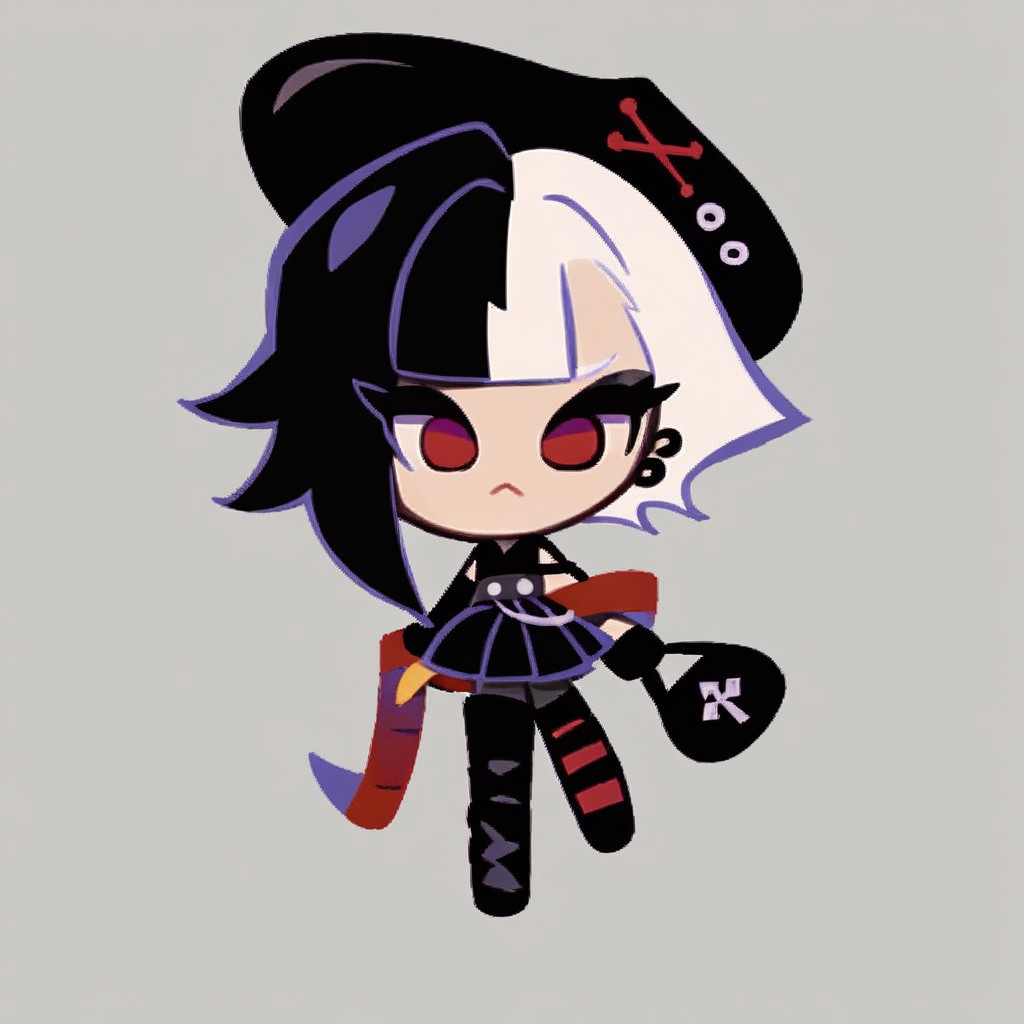 currant, black and white hair, red eyes, black shirt, black skirt, mismatched shoes, purse, black hat, ribbon
