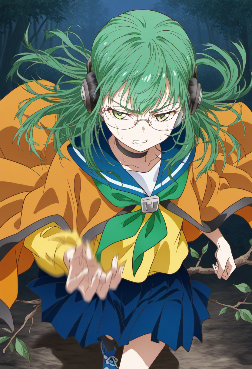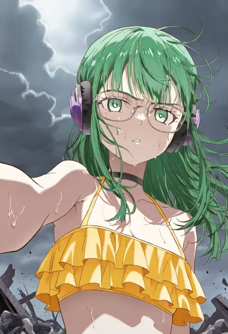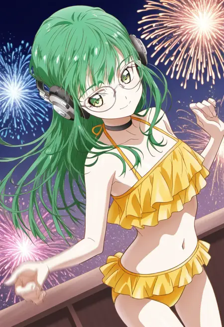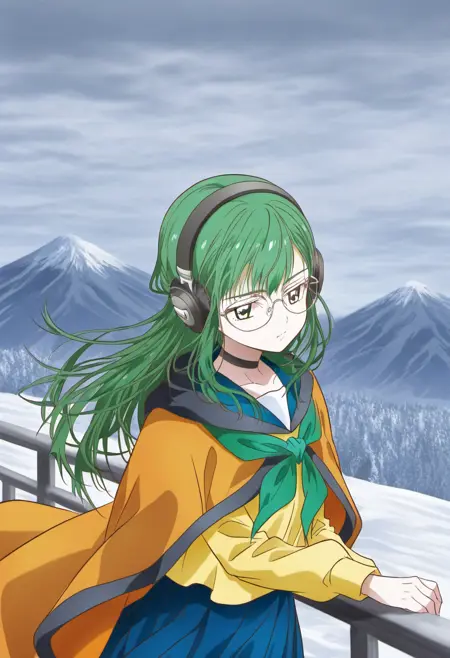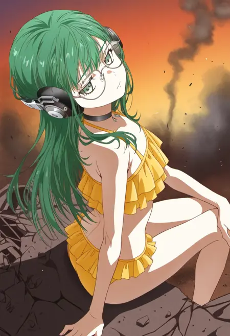 일반 프롬프트: 녹색 눈, 녹색 머리카락, 안경, 긴 머리, 헤드폰, 검은 목걸이