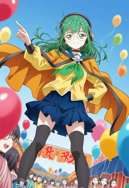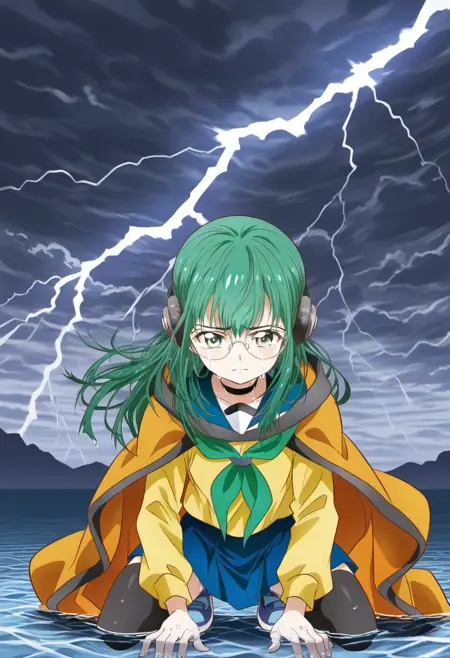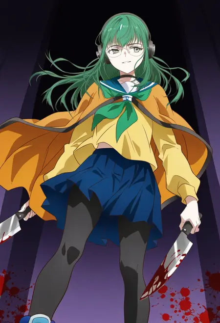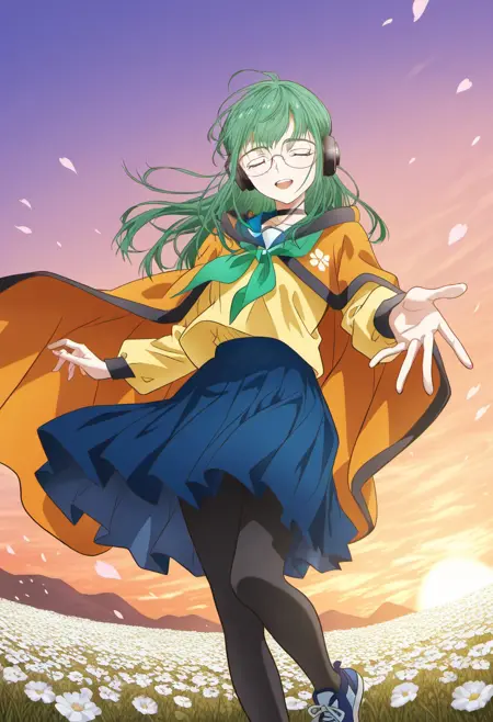 복장 프롬프트 A: 세라후쿠, 해적 칼라, 녹색 넥커친, 노란 셔츠, 주황색 망토, 파란 치마, 검은 허벅지 양말, 파란 신발
