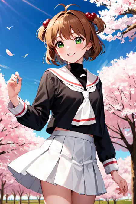 服装1(两侧上扬)木之本樱, 1girl, 棕色头发, 短发, 天线发, 两侧上扬, 发球, 绿色眼睛, 校服, 白色水手领, 黑色上衣, 长袖, 白色裙子, 百褶裙