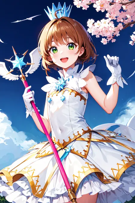服装4木之本樱, 1girl, 棕色头发, 短发, 天线发, 天线发, 王冠, 绿色眼睛, 白色连衣裙, 无袖, 白色手套