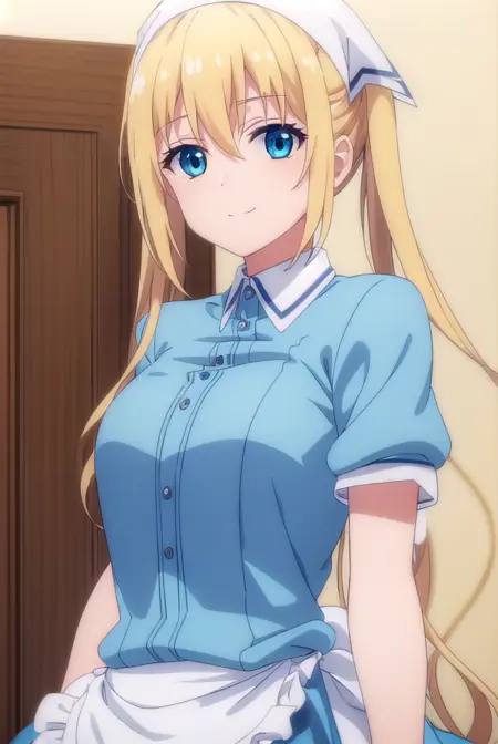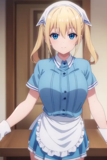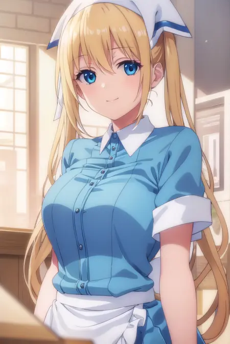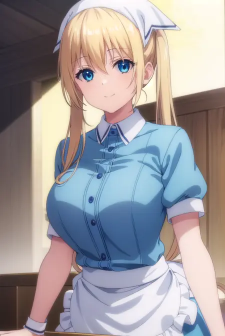 앞치마, 파란 셔츠, 파란 치마, 프릴이 있는 앞치마, 프릴, 장갑, 머리 스카프, 셔츠, 짧은 소매, 치마, 유니폼, 허리 앞치마, 웨이트리스, 흰색 앞치마, 흰색 장갑