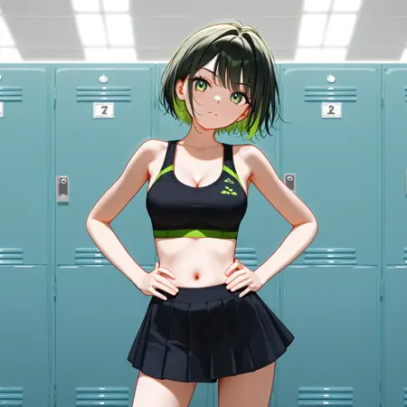 V2版本只需在提示中加入“GreenStreaks”即可生效,但若同时包含“short hair”可确保头发长度正确。