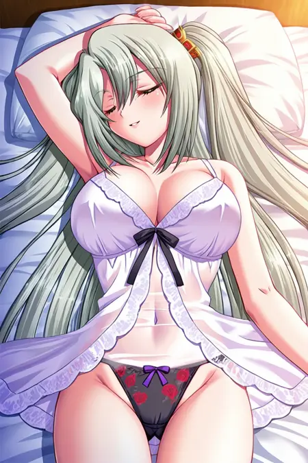 봉제 의상: BONLIESE, 골든 서클릿, 골든 헤어핀, 회색 머리, 긴 머리, 트윈테일, 루비 눈, 중앙 갈라진 앞머리, 보석 목걸이, 라텍스 플랑지, 마이크로 비키니, 보석 페스티, 프릴이 있는 라텍스 코르셋, 라텍스 팔꿈치 장갑, 라텍스 티인, 프릴이 있는 라텍스 캐프 스커트, 프릴이 있는 양말