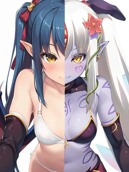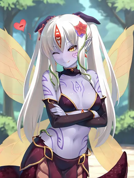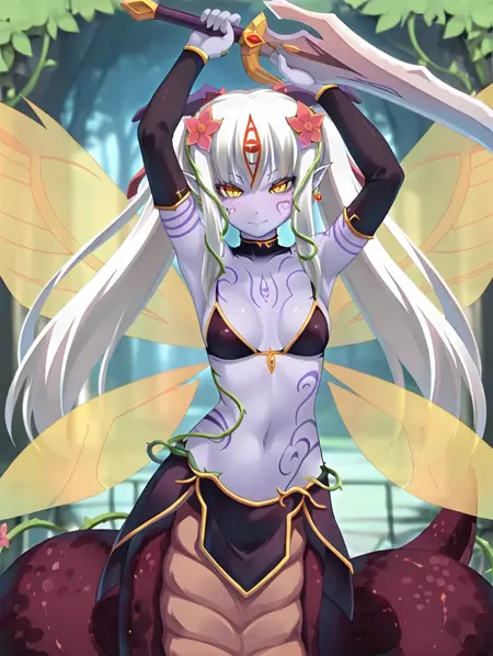 NerisAlice,白发,双马尾,头发上带花朵,藤蔓,长发,蛇女,黄眼,胸部纹身,怪物女孩,蛇娘,紫色纹身,尖耳朵,角,彩色皮肤,紫色皮肤,竖瞳,鳞片,面部纹身,分离袖子,黑色袖子,裙子,胸罩,珠宝,发饰,耳环,