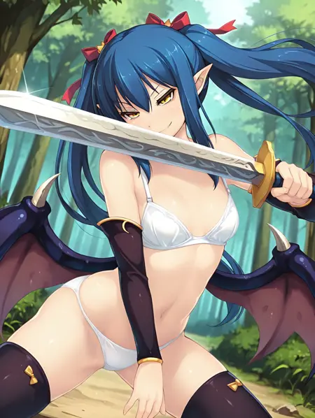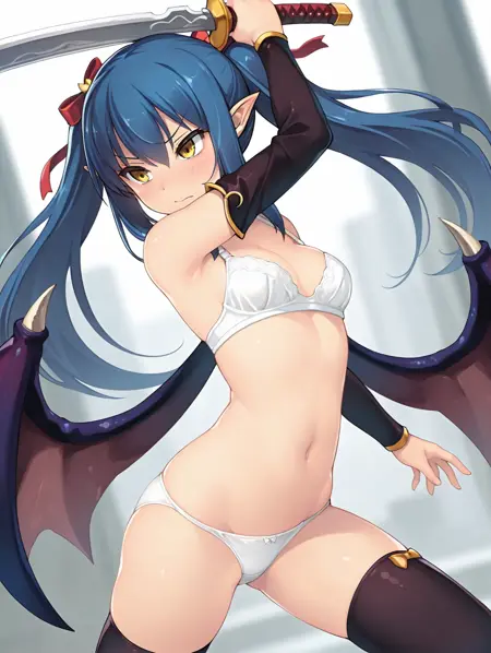 Neris,蓝发,双马尾,发带,长发,黄眼,恶魔女孩,恶魔翅膀,尖耳朵,分离袖子,黑色袖子,黑色过膝袜,泳装,白色比基尼,锁骨,