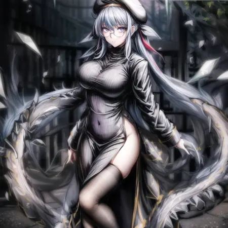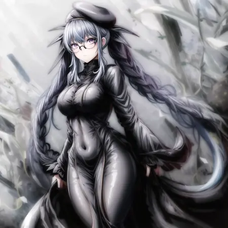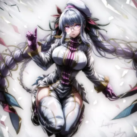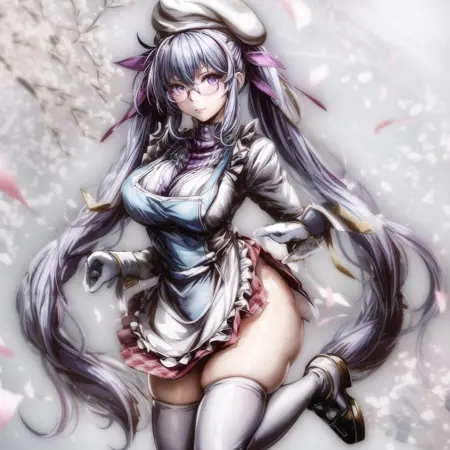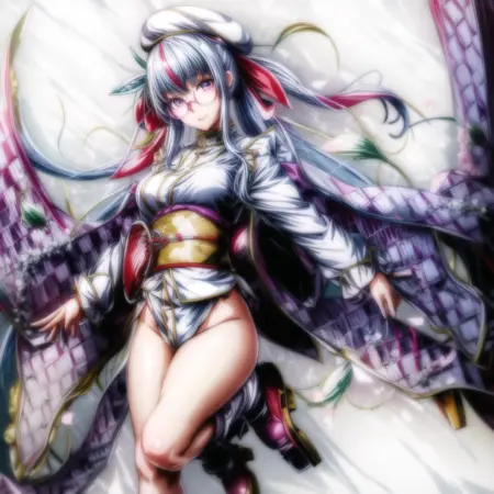 lora:Olminu:0.55,1girl,white hair, twintails, Oliminu,solo,long hair, glasses, purple eyes,ribbon, blue hair, beret, hair ribbon,full body,