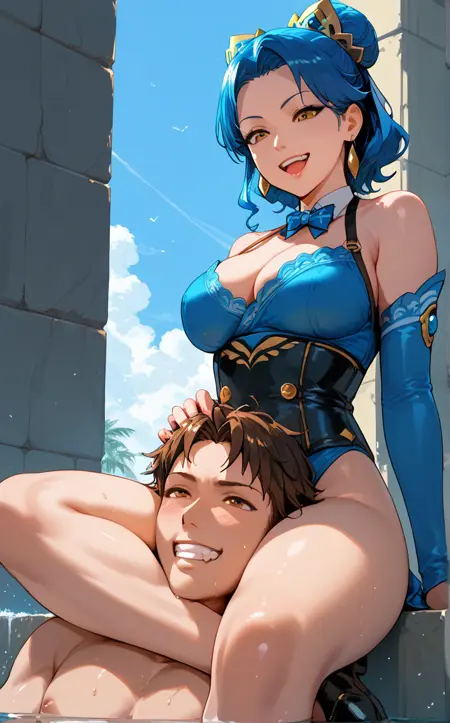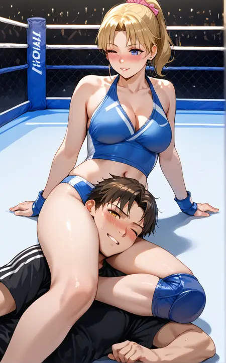 OnSideLying_ThighLegLock_ownwaifu, A Man's Head stuck between Woman's thighs, 1boy, 1girl, smile, navel, one eye closed, hetero, clenched teeth, grin, wrestling, strangling, leg lock, thigh lock, legs, on side, lying