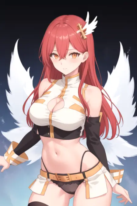 | 학습된 단어 | AriaKisaki, 1girl, solo, long hair, large breasts, white shirt, hair ornament, black thighhighs, navel, cleavage, hair between eyes, bare shoulders, black panties, red hair, detached sleeves, wings, midriff, belt, white crop top, orange eyes, highleg panties, cleavage cutout복사됨! |