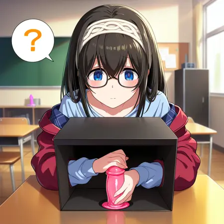 1girl, hand in box, black box, hand job, holding box,