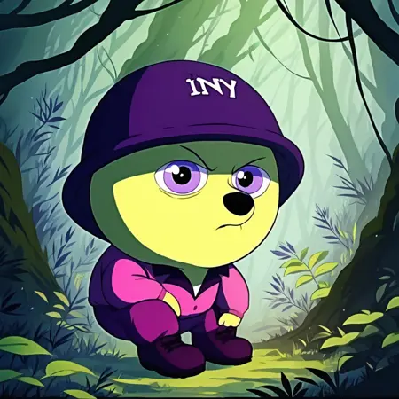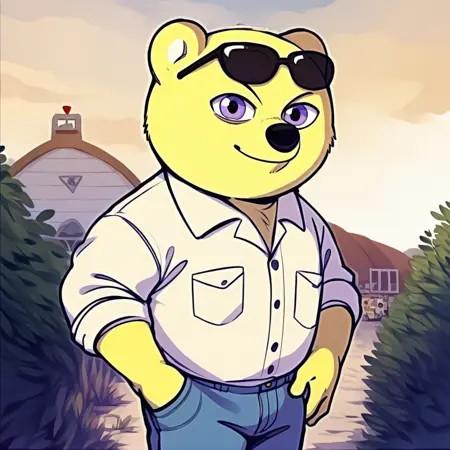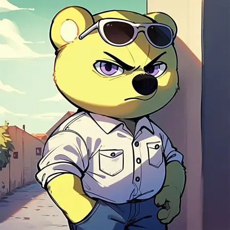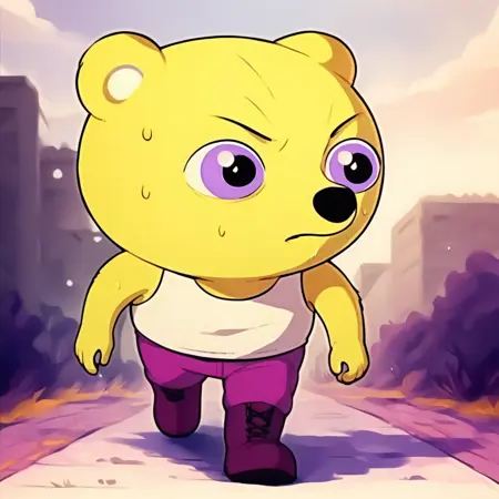 키워드: 곰, 1남자, 혼자, 보라색 눈, 노란 털, 웃고 있음, 둥근 머리, 큰 코, shortstack (선택사항)