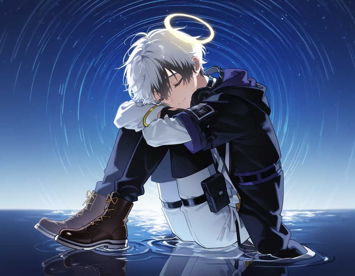 1boy, adnachiel \(arknights\), adnachiel, 기울어진 환상, 노란 눈, 밝은 동공, 단발, 흰 머리, 검은 줄무늬 머리, 짧은 옷 위에 긴 소매, 흰색 학교복, 흰 셔츠, 금색 단추, 칼라 셔츠, 흰 소매, 소매단, 초커, 검은 헤드폰, 목에 둘러진 헤드폰, 검은 재킷, 가슴 벨트, 짧은 소매 재킷, 후드 위로, 팔에 두른 밴다나, 한쪽 손목 팔찌, 열린 재킷, 허벅지 스트랩, 허벅지 파우치, 이색 바지, 흰 바지, 검은 바지, 손가락 없는 장갑, 검은 장갑, 갈색 부츠, 흰 신발 ****,