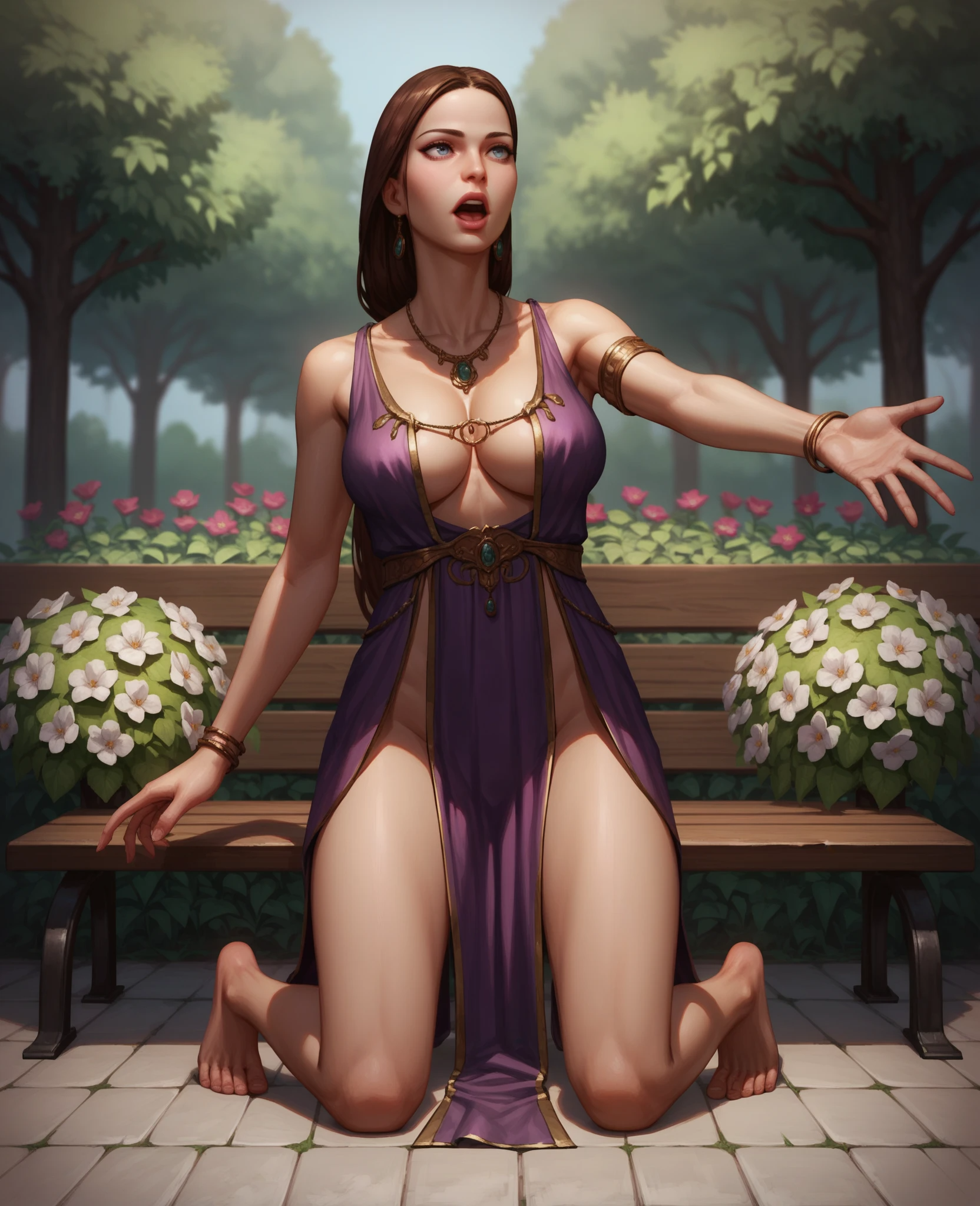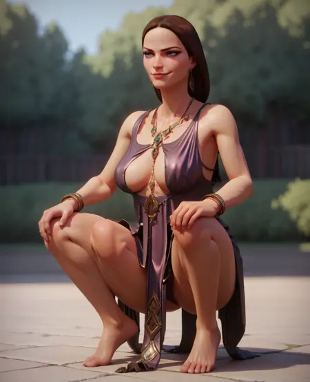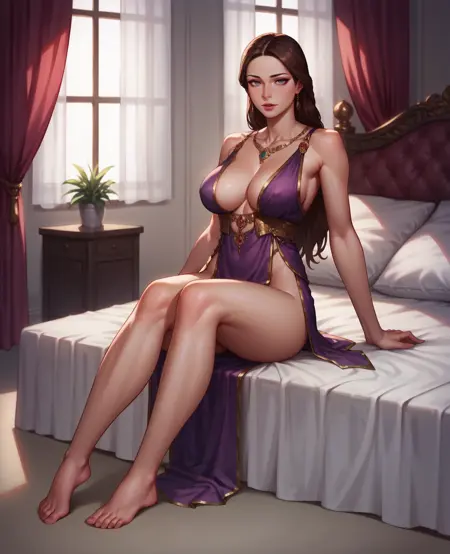 衣装: ジュエリー、素足、露出度の高い紫のドレス、腰のカーテン、胸元