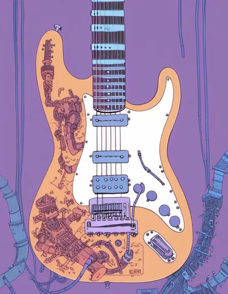 以josan-gonzalez风格绘制的插图:一名穿着西装的男子手持吉他和漂浮的麦克风,用手比出魔鬼手势