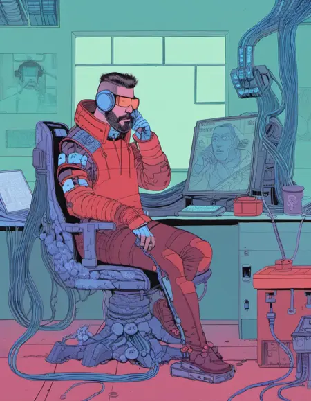 以josan-gonzalez风格绘制的插图:一辆汽车露出引擎,配备方形车轮,车里坐着一个大型机器人和三名男子,停在一家商店前的繁忙街道上