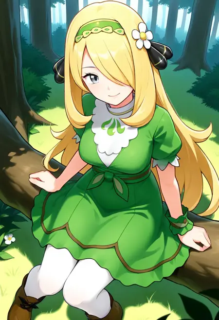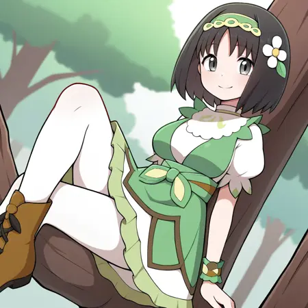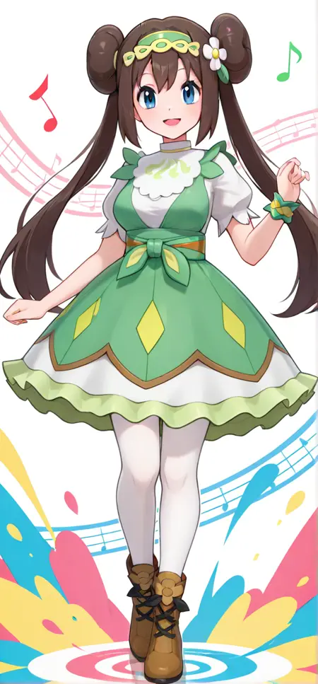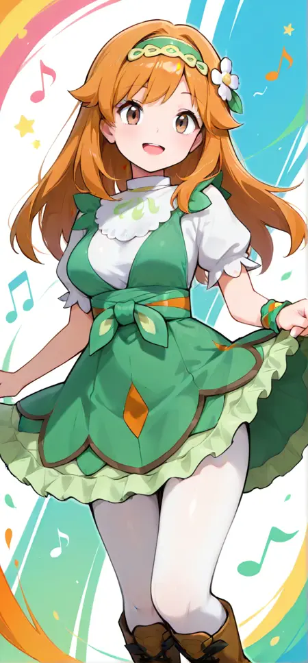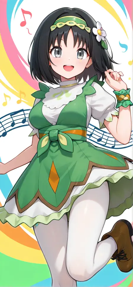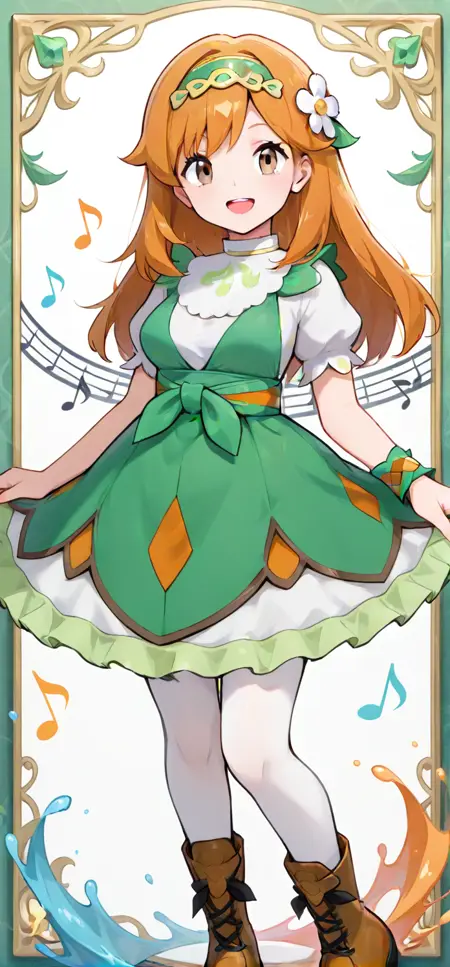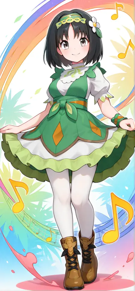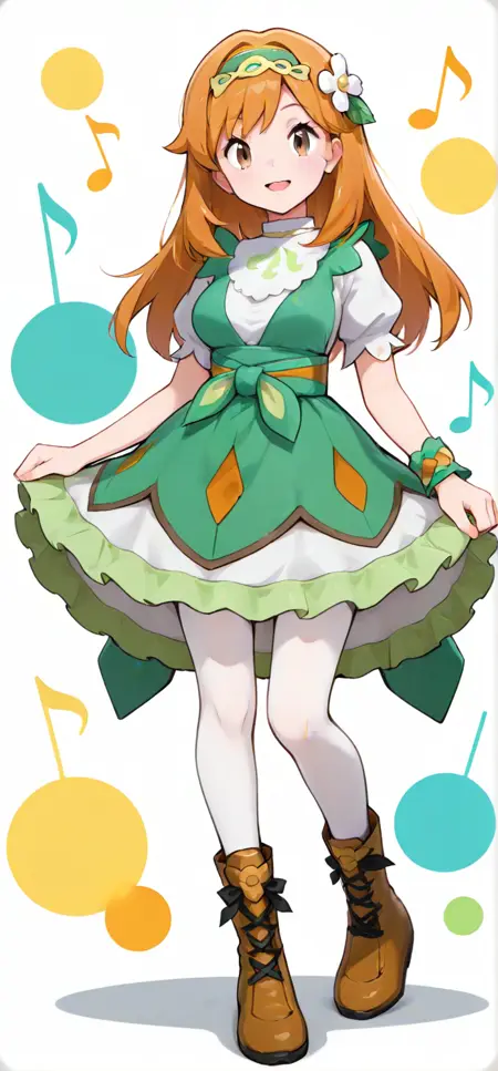 hair ornament, green hairband, hair flower, green dress, puffy short sleeves, single wrist cuff, white pantyhose, boots, brown footwear