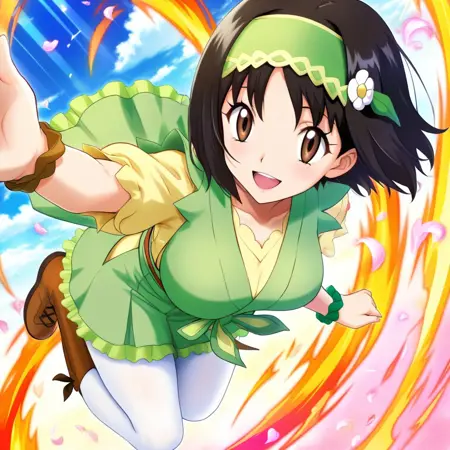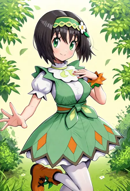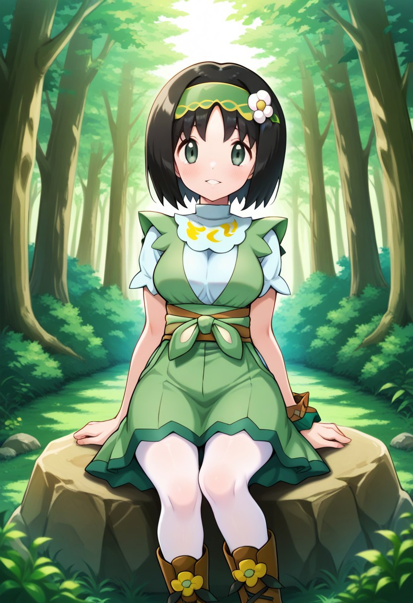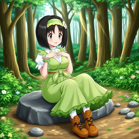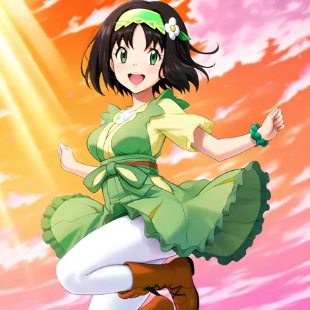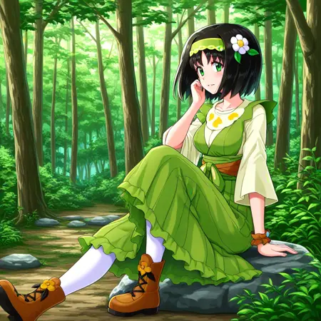 sygerika, green_eyes, black_hair, short_hair, green_hairband, hair_flower, dress, green_dress, short_sleeves, bracelet, white_pantyhose, boots, brown_footwear