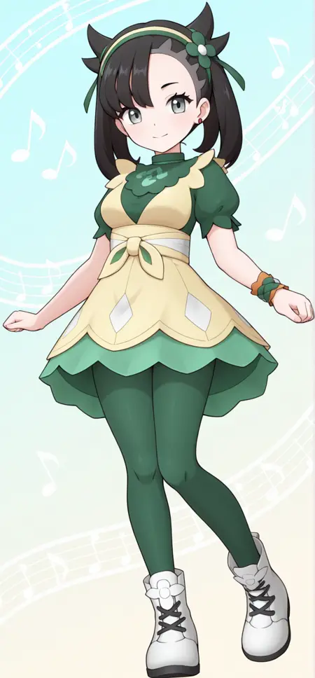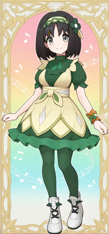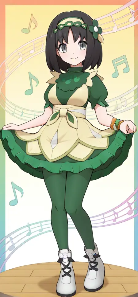 hair ornament, green hairband, hair flower, green dress, beige dress, puffy short sleeves, single wrist cuff, green pantyhose, boots, white footwear