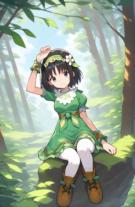 sygerika, grey eyes, black hair, short hair, bangs, hair ornament, green hairband, hair flower, green dress, puffy short sleeves, single wrist cuff, white pantyhose, boots, brown footwear
