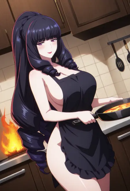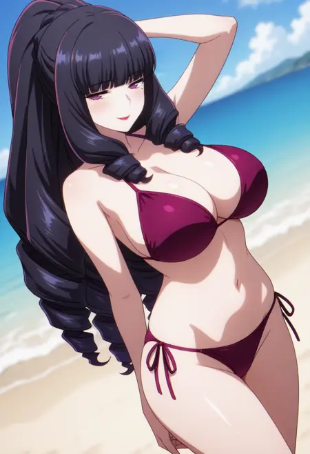 yotsuba_maya, very long hair, black hair, blunt bangs, drill sidelocks, ponytail, lipstick, makeup, (mole under eye:0.8), mature female