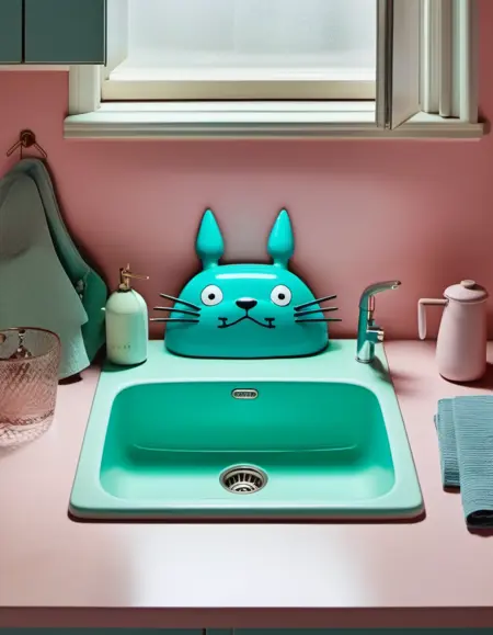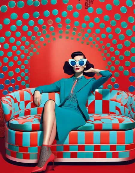 • a fashion magazine photo of a woman wearing a black and white patterned swimsuit and a vivid pink swim cap, her eyes closed with vibrant blue eyeshadow and red lipstick, she floats in water against a striking background of red and yellow tiles, surrounded by a turquoise border that enhances the bold color contrast in the style of miles-aldridge