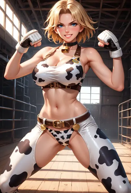 1girl, solo, breasts, blue eyes, blonde hair, large breasts, gloves, navel, underwear, panties, choker, midriff, belt, animal print, cow print, cut-out chaps, fighter gloves