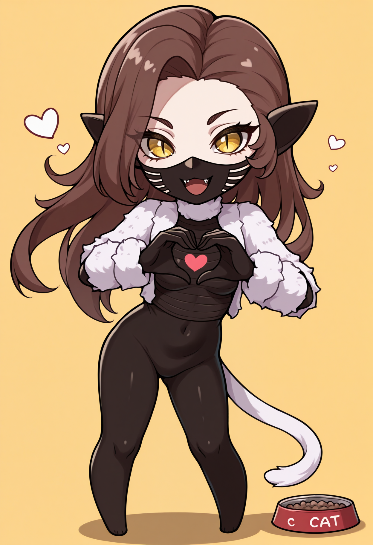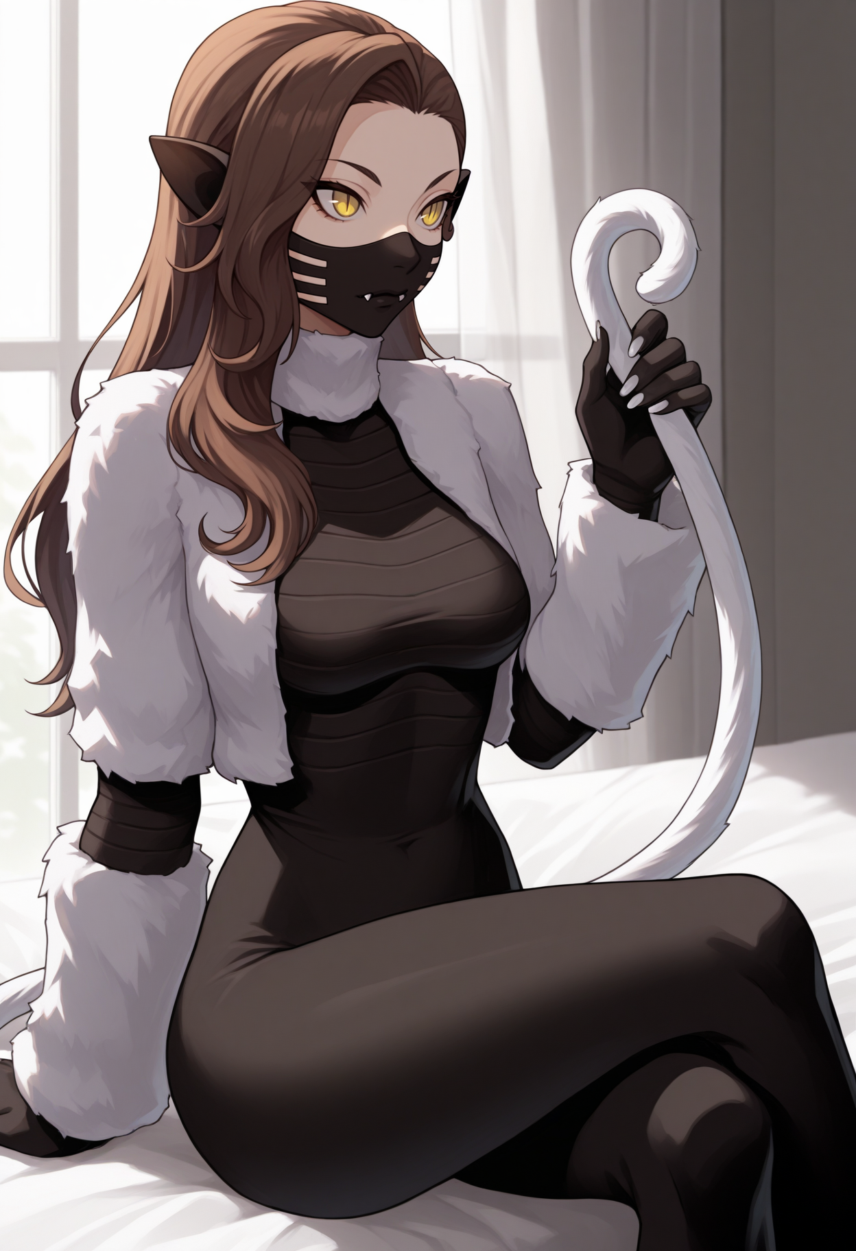 自定义服装: nekSMT,棕色长发,黄眼睛,竖瞳,口罩,尖牙,尖耳,猫尾,白色尾巴