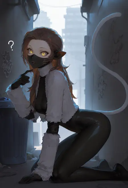 默认外观: nekSMT,棕色长发,黄眼睛,竖瞳,口罩,尖牙,尖耳,白色短款夹克,毛皮夹克,敞开式夹克,长袖,黑色紧身衣,中等胸部,猫尾,白色尾巴