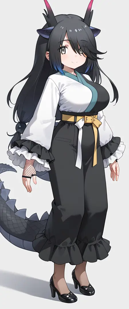 [외모] 흑룡 \(케모노 프렌즈\), 드래곤 소녀, 드래곤 뿔, 드래곤 꼬리, 꼬리, 비늘, 다색 뿔, 검은 뿔, 분홍 뿔, 여러 개의 뿔, 다색 머리카락, 검은 머리카락, 파란 머리카락, 짙은 파란 머리카락, 중앙 분할 앞머리, 긴 앞머리, 옆머리, 긴 머리, 낮게 묶인 긴 머리, 머리 장식, 한쪽 눈을 가리는 머리카락, 머리카락 사이로 보이는 눈, 검은 눈, 회색 눈, 그라데이션 눈, 다색 눈, 큰 가슴, 곡선형 몸매,