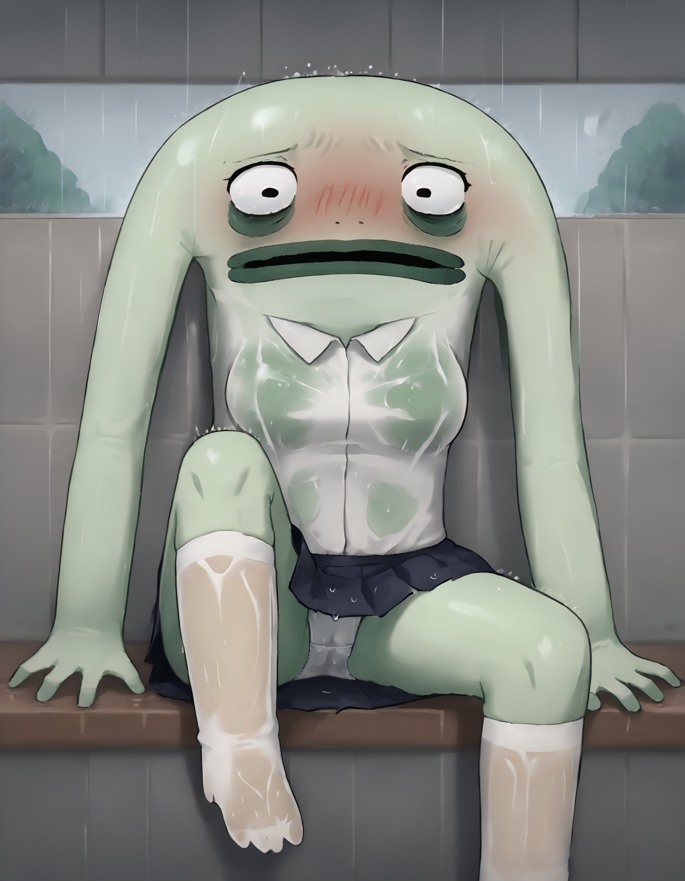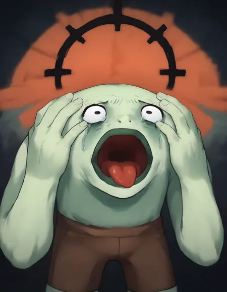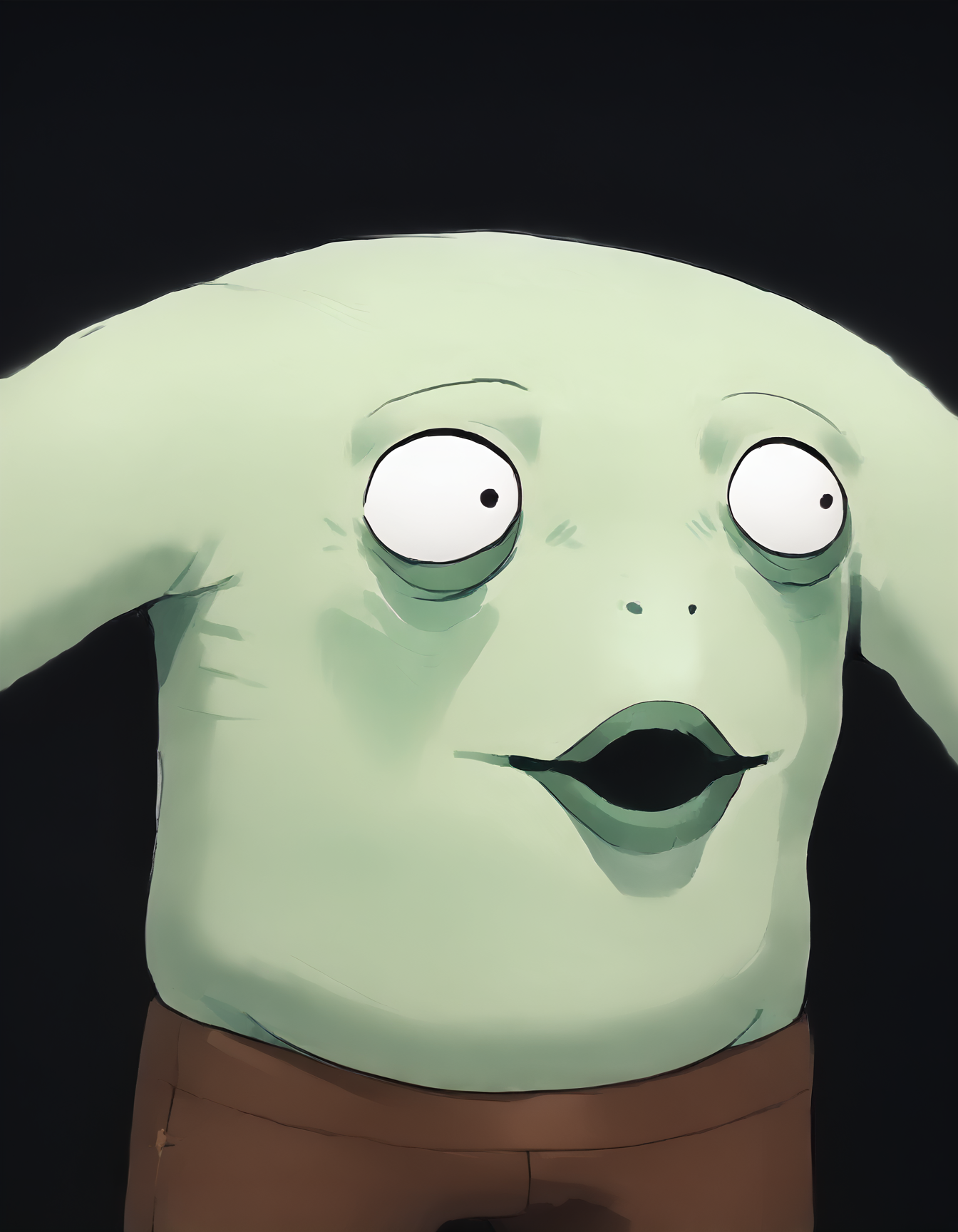 使用以下触发词生成 Mr. Frog:mrfrg, 1boy, solo, monster, green skin, large mouth, brown shorts,