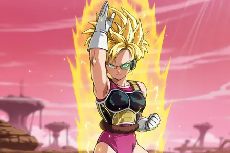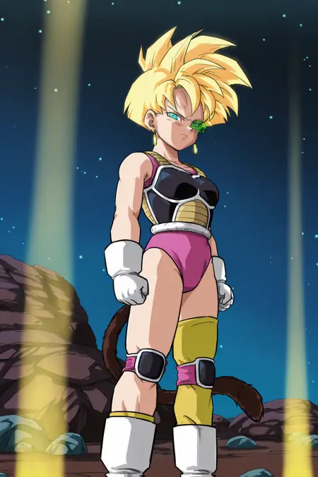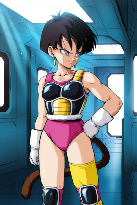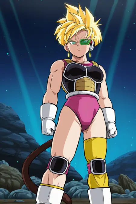 earrings, saiyan armor, pink leotard, sleeveless, white gloves, tail belt, knee pads, asymmetrical legwear, single thighhigh, socks, yellow legwear, white boots