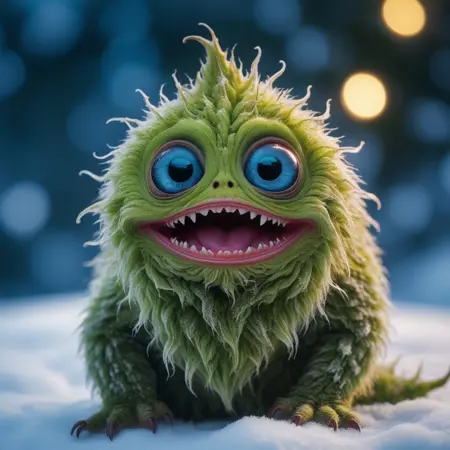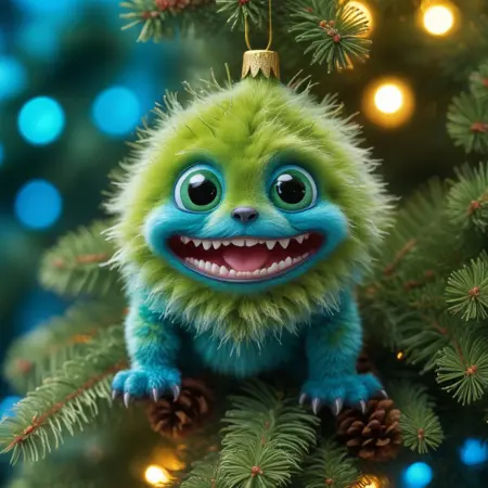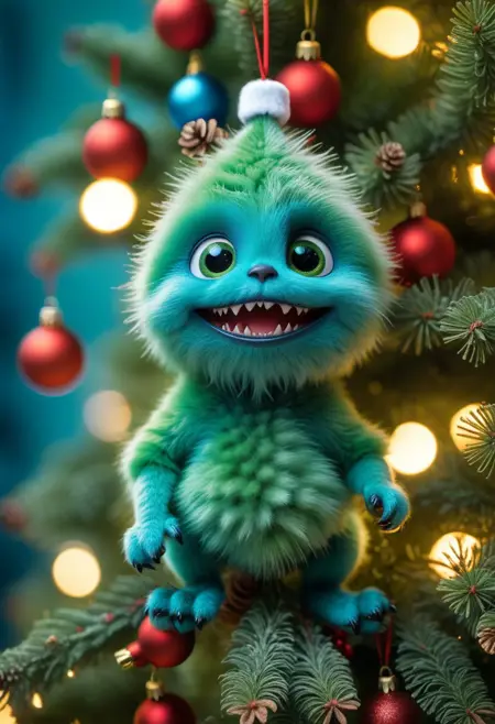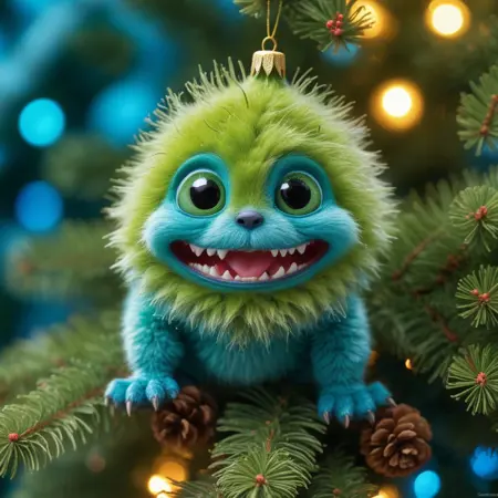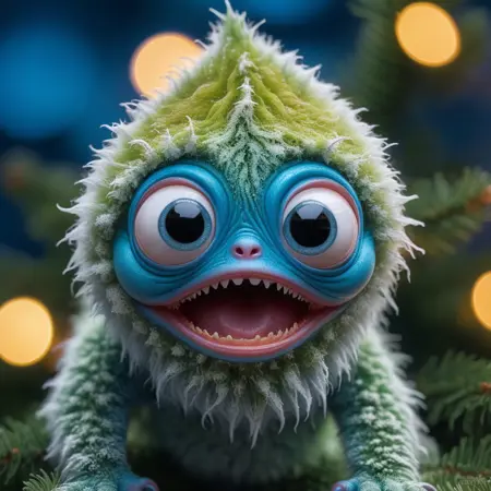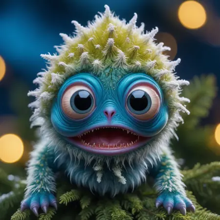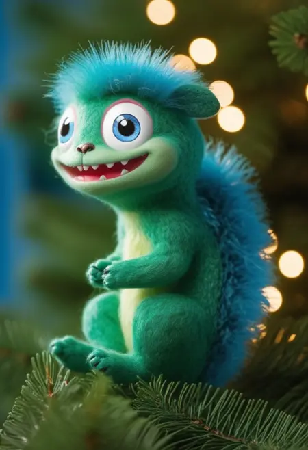 프롬프트: 아이슬란드에서 온 귀여운 몬스터, 젊은 몬스터, 크리스마스 몬스터, 좋은 생명체, 테라포밍. 외계 식물, 마키 아사이 매크로 촬영, 클로즈업, 초세부, 아트스타션 트렌드, 선명한 초점, 스튜디오 사진, 복잡한 디테일, 고세부, 세부적인 피부, 짧은 다리, 털이 많은 복부, 녹색과 파랑의 털, 짧은 털, 크리스마스 테마, 크리스마스 트리 위, 전나무, 크리스마스 맞춤 복장, 입을 다문 상태, 인간의 이빨, 호기심 어린, 키가 작음, 전신샷, 자신의 발(발가락)을 잡고 있음, 털이 많은 발(발가락), 손에 3개의 손가락, 발에 3개의 발가락, lora:xl_more_art-full_v1:1