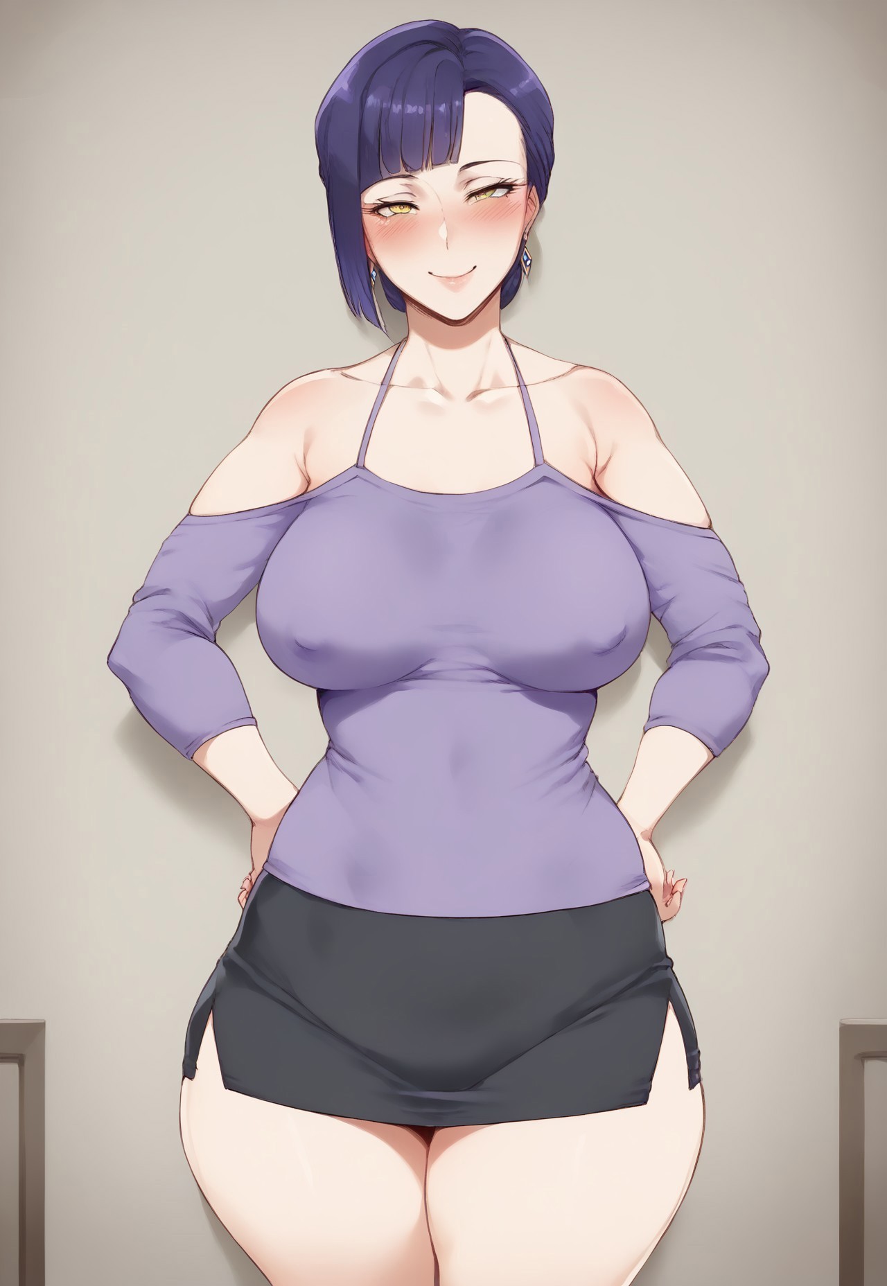 1girl, solo, huge breasts, large breasts, wide hips, thick thighs, purple hair, yellow eyes, single hair bun, purple shirt, covered nipples, collarbone, jewelry, earrings, off shoulder, bare shoulders, black skirt, miniskirt