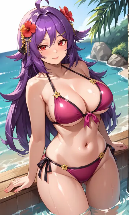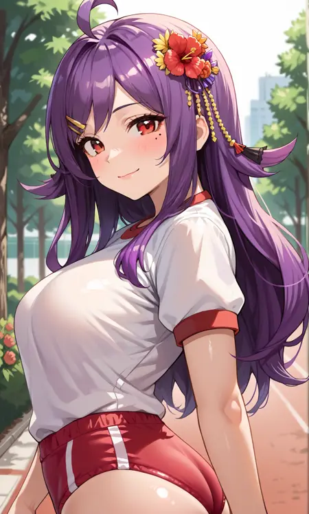 houshou, 빨간 눈, 보라색 머리카락, ahoge, 긴 머리, 점, 눈 아래 점, 꽃, 머리에 꽃, 머리 장식
