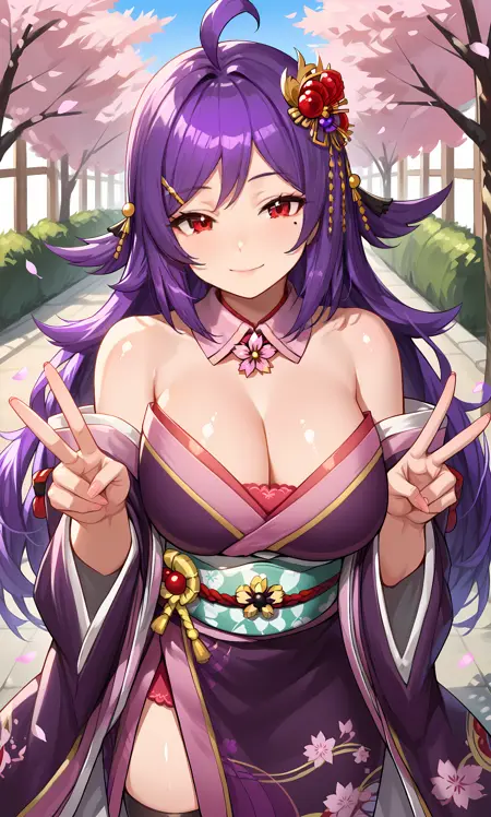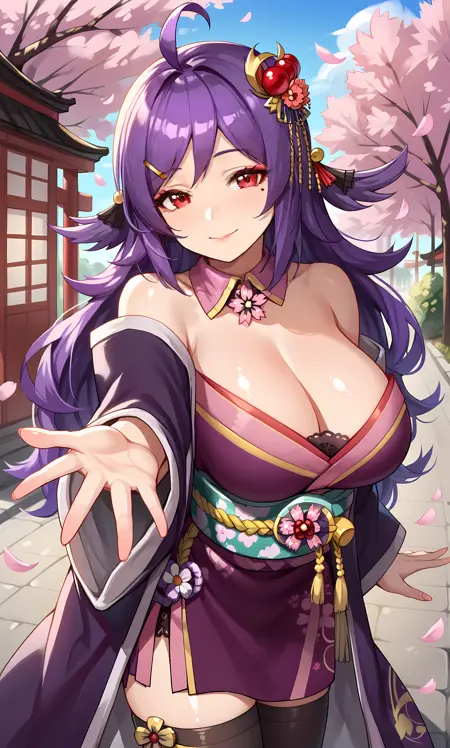 어깨 드러냄, 가슴 노출, 일본식 옷, 보라색 키모노, 어깨 드러난 키모노, 짧은 키모노, 검은 허벅지 스타킹, 보라색 코트, 넓은 소매