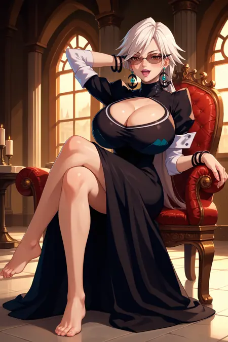 트리거 단어는 "basquashHG"이며, "낮은 포니테일, 매우 긴 머리, 흰 머리, 갈색 눈, 선글라스, 립스틱"이 필수입니다.