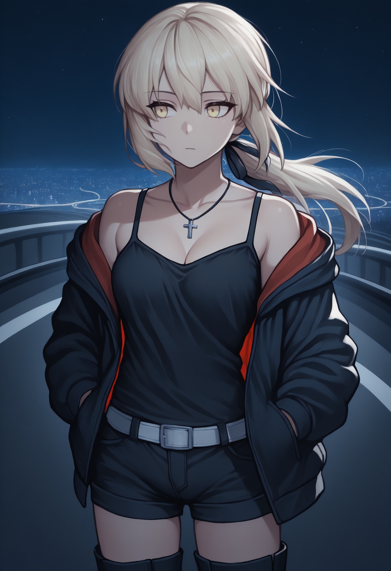 Jet Black King of Knights ver., Shinjuku 1999: sbraltblk, long hair, blonde hair, hair between eyes, sidelocks, low ponytail, hair ribbon, black ribbon, yellow eyes, black jacket, hooded jacket, hood down, open jacket, off shoulder, long sleeves, black camisole, black shorts, short shorts, white belt, black footwear, thigh boots, cross necklace, collarbone, cleavage