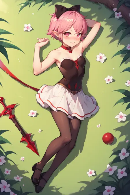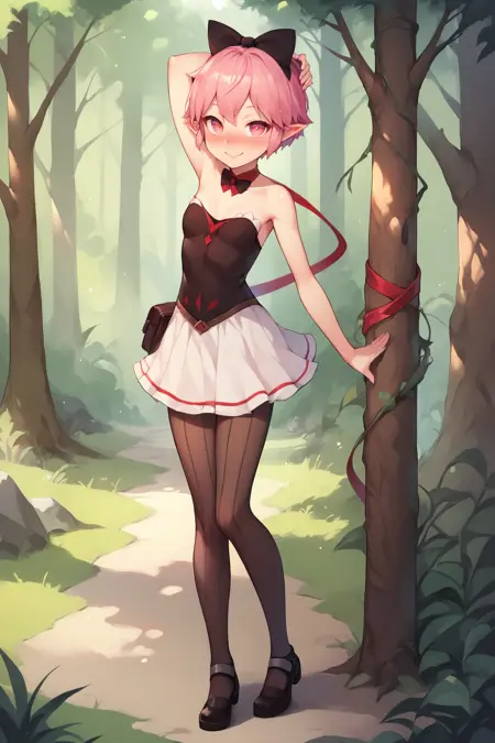➜ NinaICPXL, ピンクの目, ピンクの髪, 短い髪, 髪のリボン, 黒いリボン, 尖った耳, 小さな胸, 肩出し, 赤いショッカー, 黒いドレス, 白いスカート, 黒いパンティハウス, 黒い靴