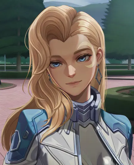 dg1, 1girl, blonde hair, long hair, blue eyes, facial mark, earrings,