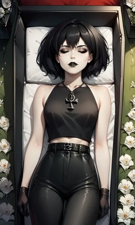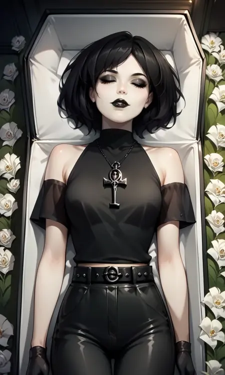 1woman, black hair, short hair,white skin, pale skin, black eyes, black shirt, black pants, ankh necklace, belt, black gloves,goth fashion,makeup,black lips