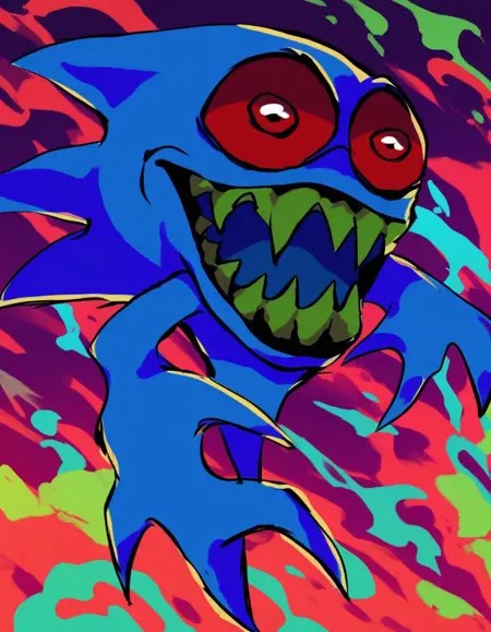 ExecunEXEFNF, 1boy, ghost, red eyes, no humans, blue skin, black sclera, colored sclera, sharp teeth, hedgehog quills on back resembling Sonic, dark teeth, colored teeth, hands, claws, horror