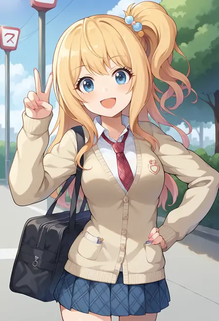 • 校服, 亚文化风格, 棕色开衫, 红色领带, 格子领带, 白色衬衫, 带领子衬衫, 袖子过腕, 超短裙, 蓝色裙子, 百褶裙, 格子裙, 书包, 小女生风格,