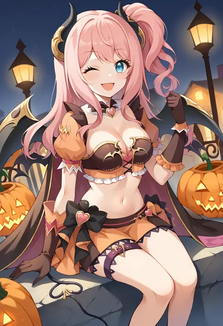 • suzunahal, 单侧高束, 斗篷, 万圣节服装, 双色胸衣, 黑色项圈, 暴露胸部, 蓬松袖子, 短袖, 露脐上衣, 条纹裙, 双色裙, 百褶裙, 橙色裙, 条纹, 裙摆蝴蝶结, 大腿绑带, 手套, 魔鬼翅膀, 不对称裤装, 靴子,