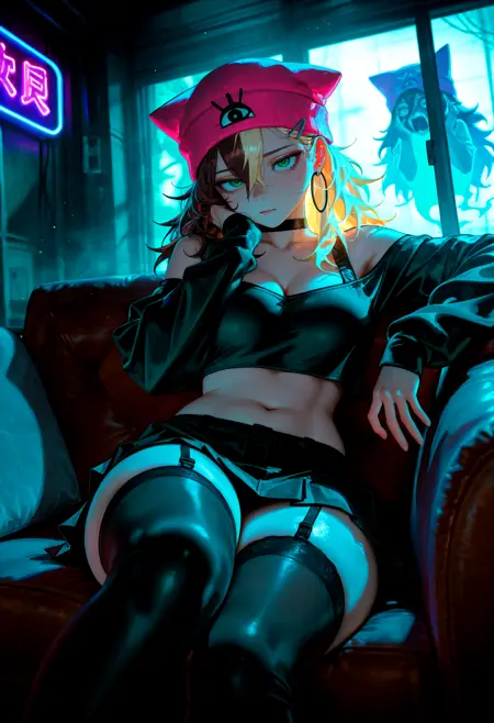 绿眼睛,三白眼,金发,棕发,双色发,分色发,(多色发),头发位于眼睛之间,中等胸部,(粗大腿:1.2),