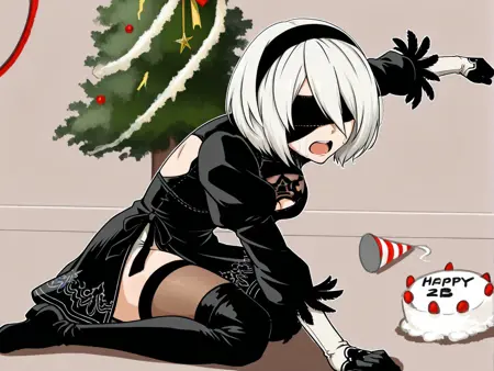 「友達を待つ」LoRAのトリガー単語:naniga, {1girl or 1boy}, {charactor tag}, party hat, solo, sitting, chair, table, food, plate, cup, cake, food, merry christmas, christmas tree, indoors,