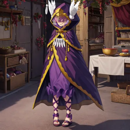 a cartoon character that is wearing a purple cape and hood, and has long hair, solo, sandals, full body, sharp teeth, feathers, smile, hood, indoors, room background, covered eyes,