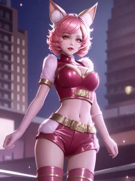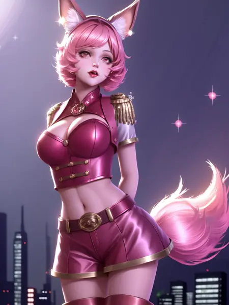 • WZRYdajiMLWJS, 1girl, solo, breasts, fox tail, fox ears, hat, white gloves, belt, orange eyes, orange hair, epaulettes, thigh boots, heart, short shorts, parted lips, looking at viewer, hat feather, jewelry,red lips, curly hair, lipstick, bangs, choker, short sleeves, mini hat, lips, buckle, makeup, short hair,cropped jacket,crop top, cityscape, night, mature female, poolside, sitting,